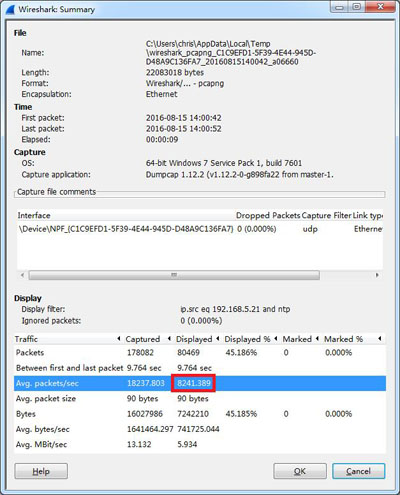 點擊菜單“Statistics/Summary”,得到每秒NTP響應數(shù)量