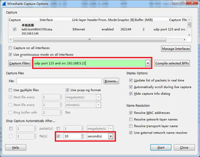 開啟wireshark,設置捕獲參數(shù)(“Capture Options”),選中“本地連接”,并設置過濾器和停止時間,并點擊“Start”,如下圖所示: