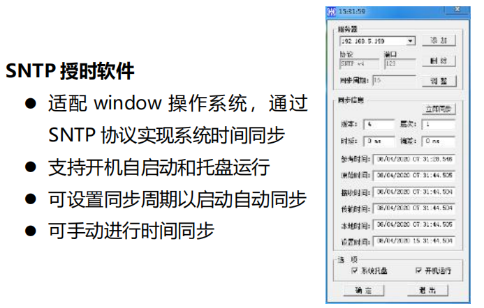 -技術(shù)指標(biāo)- 網(wǎng)絡(luò)和服務(wù) ●NTP v1/2/3/4(單播/多播/廣播/Autokey),SNTP; ●Telnet,SSH,F(xiàn)TP; ●SNMP v1/2/2c/3,MIB II (RFC1213); ●IPv4、IPv6、IPv4/IPv6 Hybrid。 服務(wù)性能 ●衛(wèi)星參考下同步精度 :<100ns; ●用戶容量 :>5,000,000; ●NTP請(qǐng)求量 :≧139000次/秒; ●可通過(guò)軟件配置支持IEEE1588v2(PTP)協(xié)議。