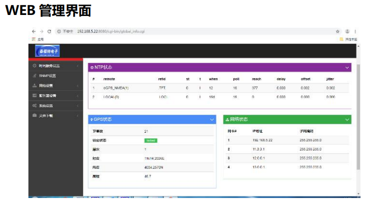 ●方便快捷、開(kāi)箱即用,用于對(duì)設(shè)備進(jìn)行全局監(jiān)控; ●含設(shè)備運(yùn)行狀態(tài):NTP狀態(tài)、北斗/GPS狀態(tài)、網(wǎng)絡(luò)狀態(tài)等; ●可進(jìn)行SNMP設(shè)置(Trap地址等)、網(wǎng)絡(luò)設(shè)置、NTP設(shè)置; ●可開(kāi)關(guān)服務(wù)器當(dāng)前運(yùn)行的服務(wù); ●可下載相關(guān)配置文件和MIB描述文件。